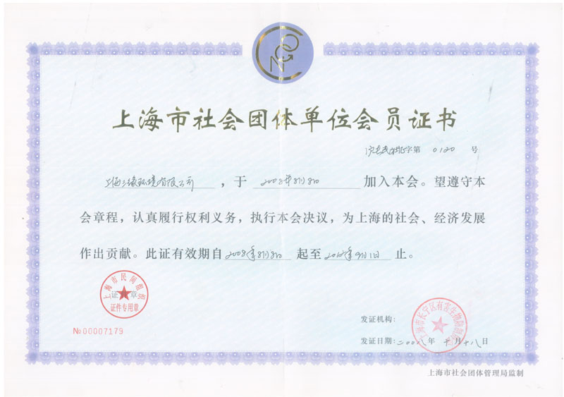 上海市社會團體單位會員證 | 南京三緣/全國連鎖/總部設在上海